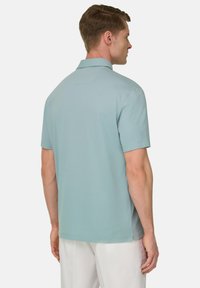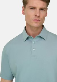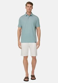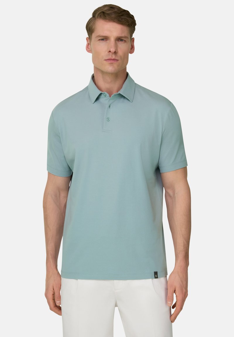 Mann in hellblauem kurzärmligem Poloshirt und weißer Hose, steht mit entspannten Armen vor einem schlichten weißen Hintergrund.