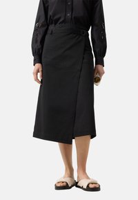 Frau trägt einen schwarzen Midi-Wickelrock, schwarze Langarmbluse mit Spitzenausschnitten, beigen Sandalen und hält eine Sonnenbrille in der rechten Hand.