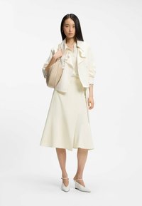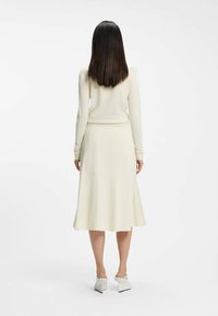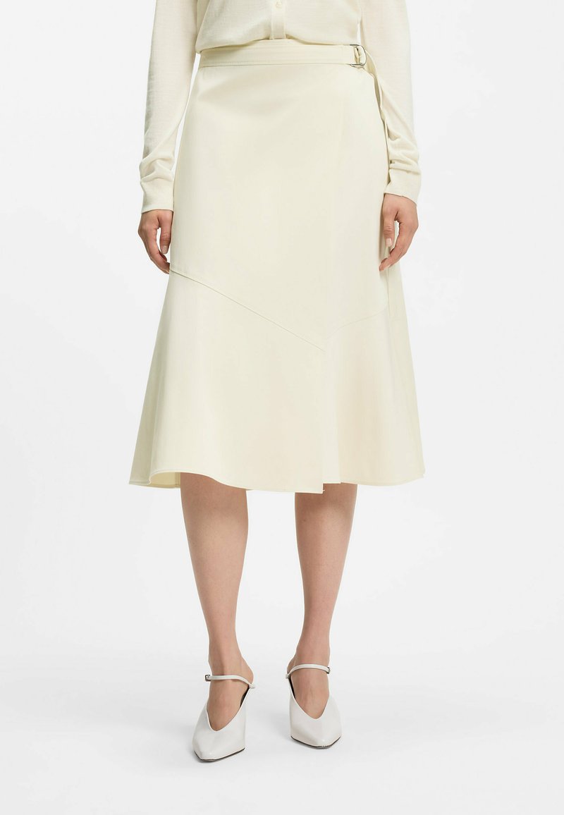 Frau trägt einen off-weißen Midirock mit seitlichem Schnallendetail, kombiniert mit einem passenden Langarmshirt und weißen Mary Jane High Heels.