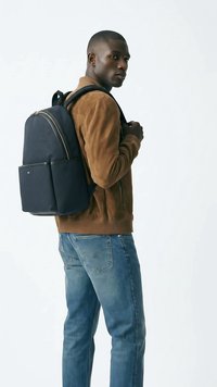 Mann trägt eine braune Jacke, blaue Jeans, schwarze Schuhe und einen schwarzen Rucksack, steht seitlich gewandt vor einem schlichten weißen Hintergrund.