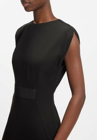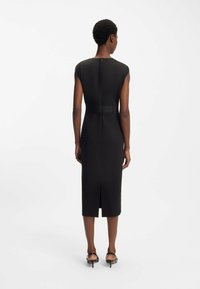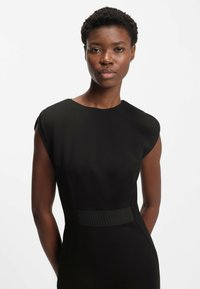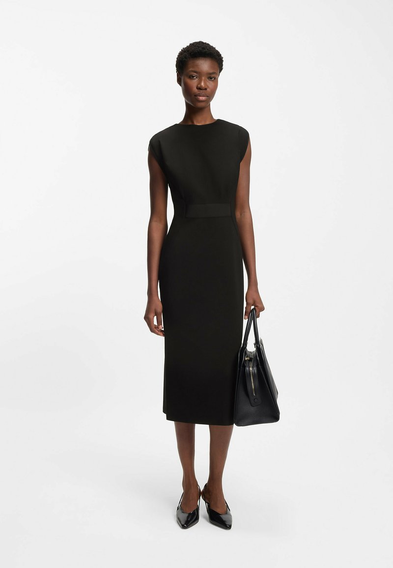 Schwarzes figurbetontes Midikleid mit kurzen Flügelärmeln und einem strukturierten Design, kombiniert mit einer schwarzen Handtasche und spitzen schwarzen High Heels.