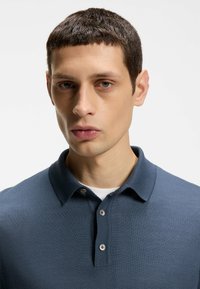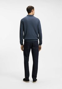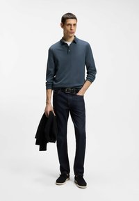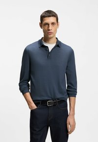 Marineblaues langärmeliges Polohemd aus leichtem Stoff, mit Kragen und zwei Knöpfen, kombiniert mit dunklen Denim-Jeans und einem schwarzen Gürtel.