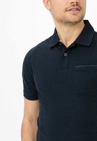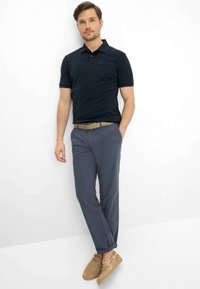 Mann mit kurzen braunen Haaren, der ein dunkelblaues Poloshirt und graue Hosen mit einem hellbraunen Gürtel trägt, steht mit den Händen in den Taschen.