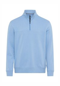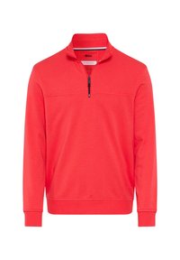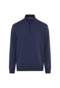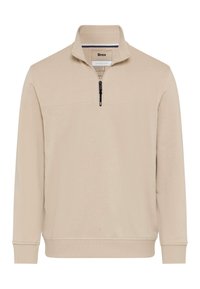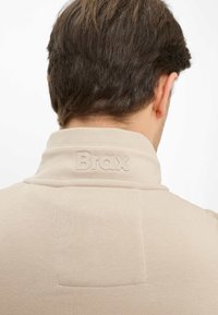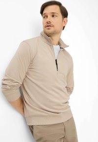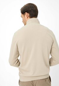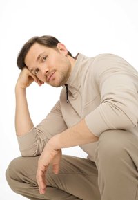 Mann trägt einen beigefarbenen Pullover mit Viertel-Reißverschluss und Hose, steht mit den Händen hinter dem Rücken und schaut nach links vor einem weißen Hintergrund.