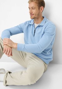 Mann trägt ein hellblaues Sweatshirt mit Viertel-Reißverschluss über einem weißen Hemd und beiger Hose, steht mit einer Hand in der Tasche und schaut nach unten.