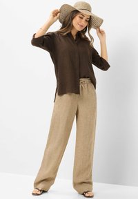 Frau trägt ein dunkelbraunes Hemd mit Knöpfen und hochgekrempelten Ärmeln sowie hellbeige Hose mit Kordelzug, posiert mit einer Hand in der Tasche und der anderen in der Nähe des Halses.