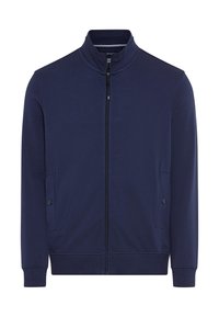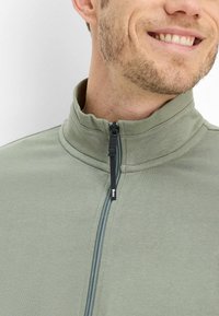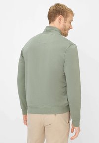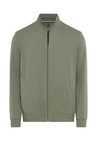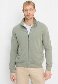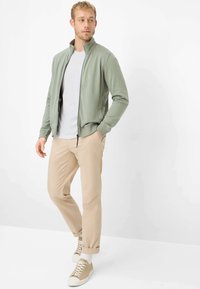 Mann trägt hellgrüne Jacke mit Reißverschluss über weißem Hemd und beiger Hose, steht vor weißem Hintergrund.