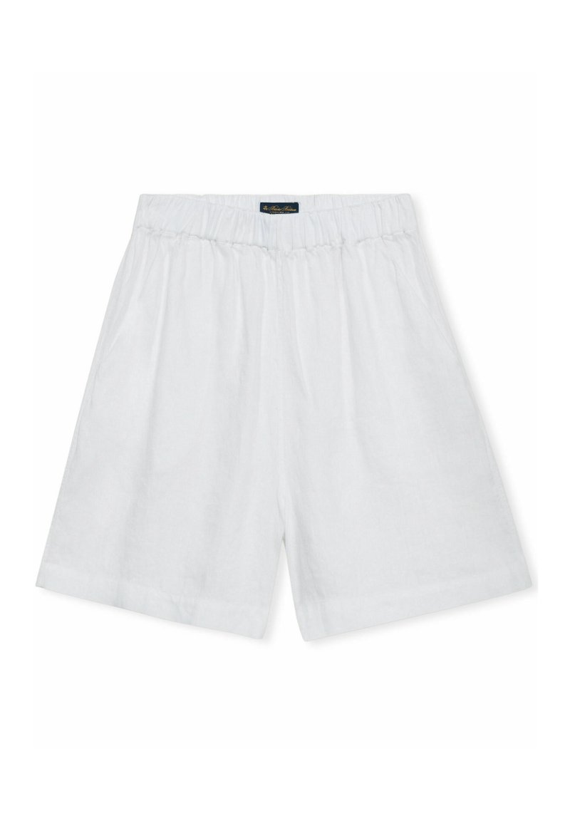 Weiße Shorts mit elastischem Bund und lockerem Schnitt, aus leichtem Stoff, mit einem kleinen Markenlabel in der Mitte des Bundes.