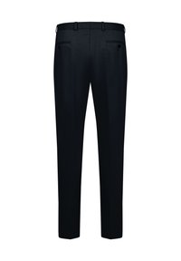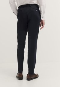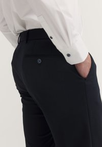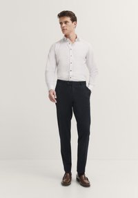 Schwarze, maßgeschneiderte Hosen mit flachem Vorderteil, Gürtelschlaufen und seitlichen Taschen. Getragen mit braunen Loafern und einem kontrastierenden weißen Hemd mit Knöpfen.