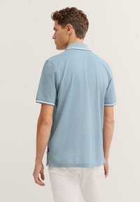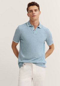 Helles blaues Poloshirt aus strukturiertem Material, mit kontrastierendem weißen Kragen und Abschluss an den Ärmeln sowie einer Zwei-Knopf-Leiste. Getragen mit weißen Hosen.