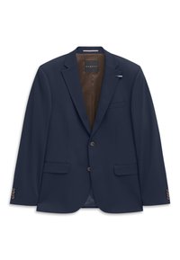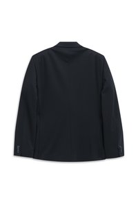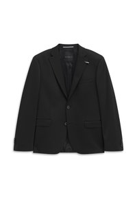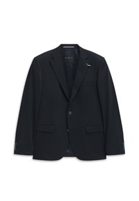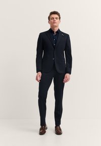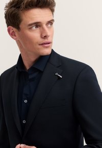 Junger Mann im schwarzen Anzug und marineblauem Hemd steht mit den Händen in den Taschen und schaut seitlich vor einem schlichten hellen Hintergrund.
