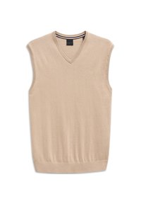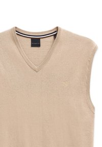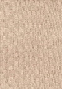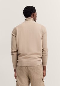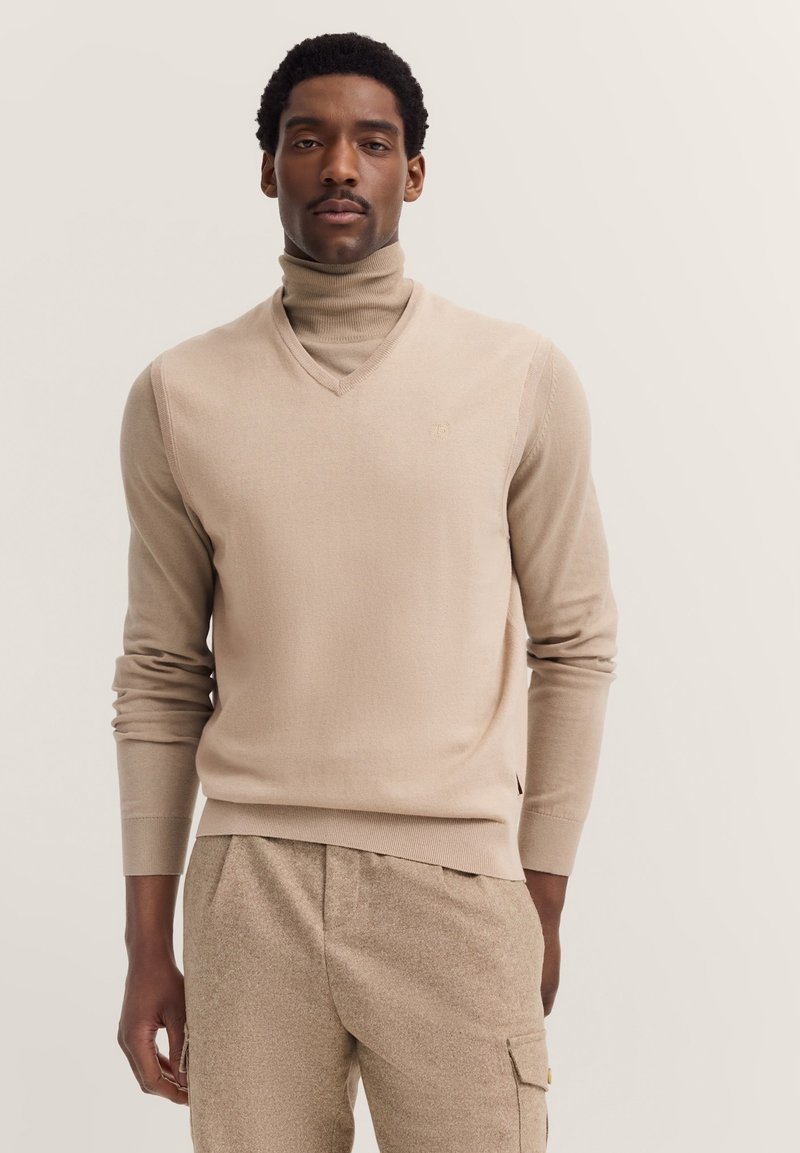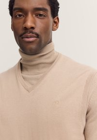 Beige Rollkragenpullover mit V-Ausschnitt, gerippten Bündchen und seitlichen Schlitzen. Die glatte Textur und der enganliegende Schnitt ergänzen die lässig geschnittenen beigen Hosen.