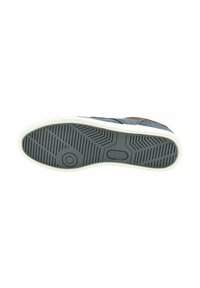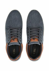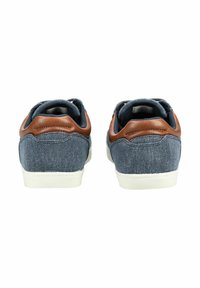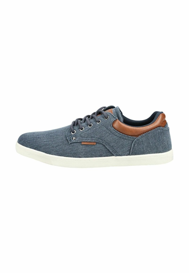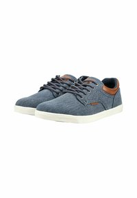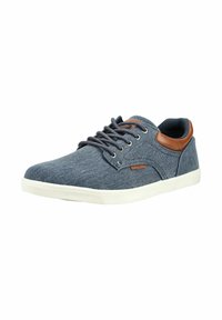 Legerer Herren-Sneaker in niedrigem Schnitt aus strukturiertem grauem Stoff mit braunen Lederakzenten und weißer Gummisohle, von der linken Seite gezeigt.