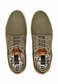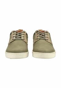 Legerer olivgrüner Sneaker in niedriger Ausführung mit perforierter Spitze, Schnürverschluss, gepolstertem Knöchelkragen und weißer Gummisohle.
