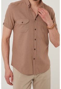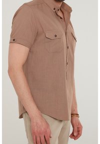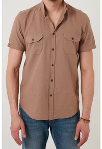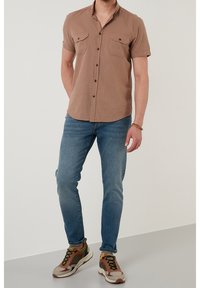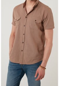 Mann trägt ein kurzärmeliges braunes Hemd mit Knöpfen und zwei Brusttaschen sowie blaue Jeans, steht vor einem schlichten Hintergrund.