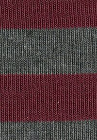 Ein Paar kniehoher Socken mit horizontalen Streifen in Burgunderrot, Schwarz, Grau und Hellgrau, präsentiert auf einem weißen Hintergrund.