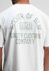 Mann in weißem T-Shirt mit grünem Text "Butcher of Blue Cutters Eighteen Quality Clothing Company" auf dem Rücken, kombiniert mit blauen Jeans.