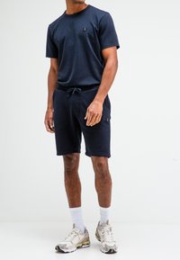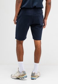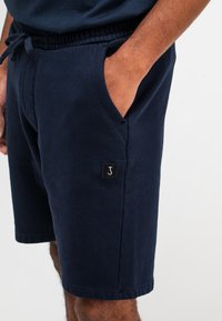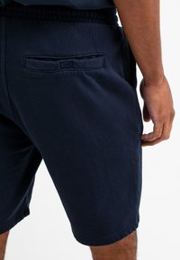 Dunkelblaue Baumwollshorts mit elastischem Bund und Kordelzug. Sie verfügen über seitliche Taschen und bieten einen lässigen, bequemen Schnitt.
