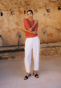 Frau mit kurzen dunklen Haaren in einem orangefarbenen Strickoberteil, weißen Hosen und schwarzen Absätzen steht mit verschränkten Armen vor einer rustikalen, strukturierten Wand.