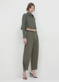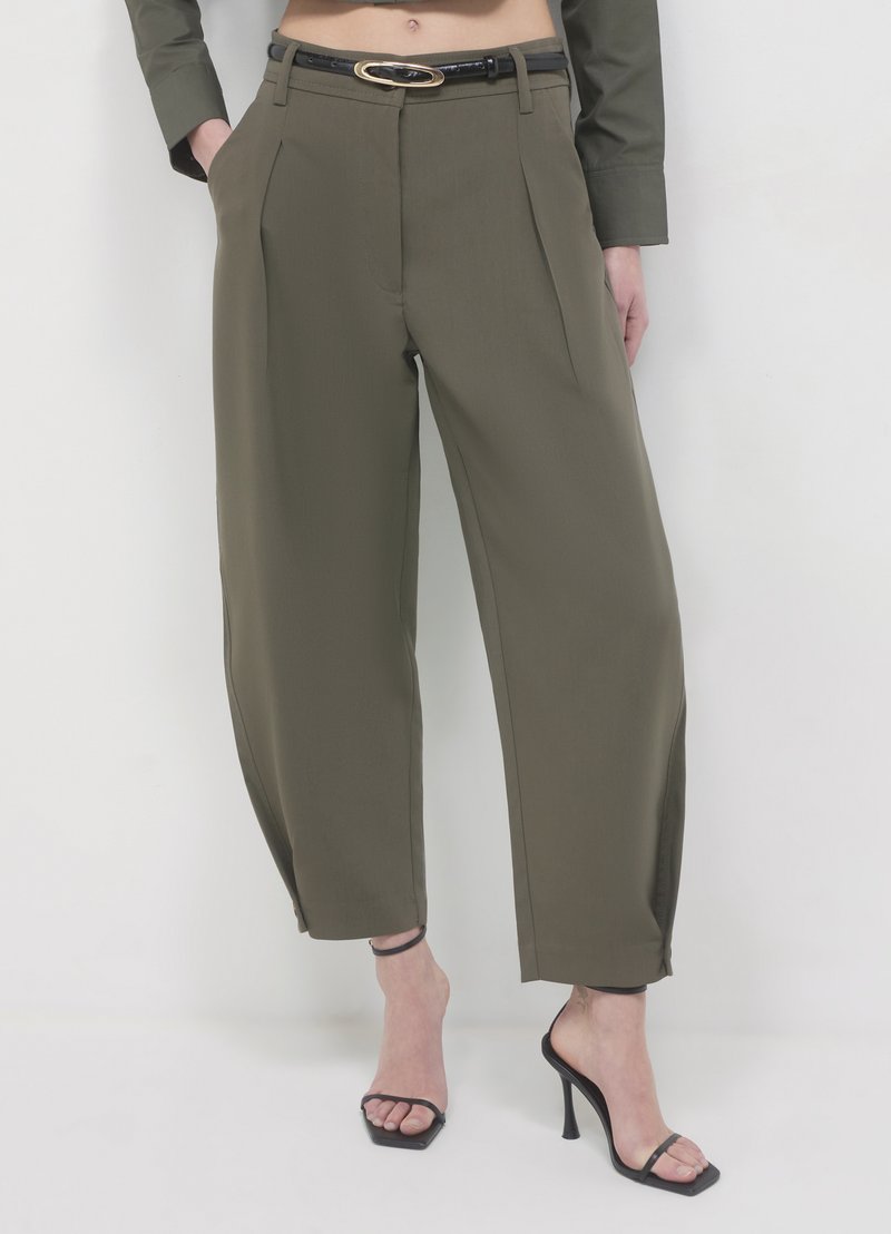 Olivgrüne, hoch taillierte Hose mit Falten, Seiten taschen, einem schwarzen Gürtel mit goldenen Beschlägen und einem schmal zulaufenden Knöchellänge-Schnitt.