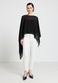 Frau trägt ein durchsichtiges schwarzes asymmetrisches Top, weiße Hose, goldene Ohrringe und Armbänder vor einem schlichten hellen Hintergrund.