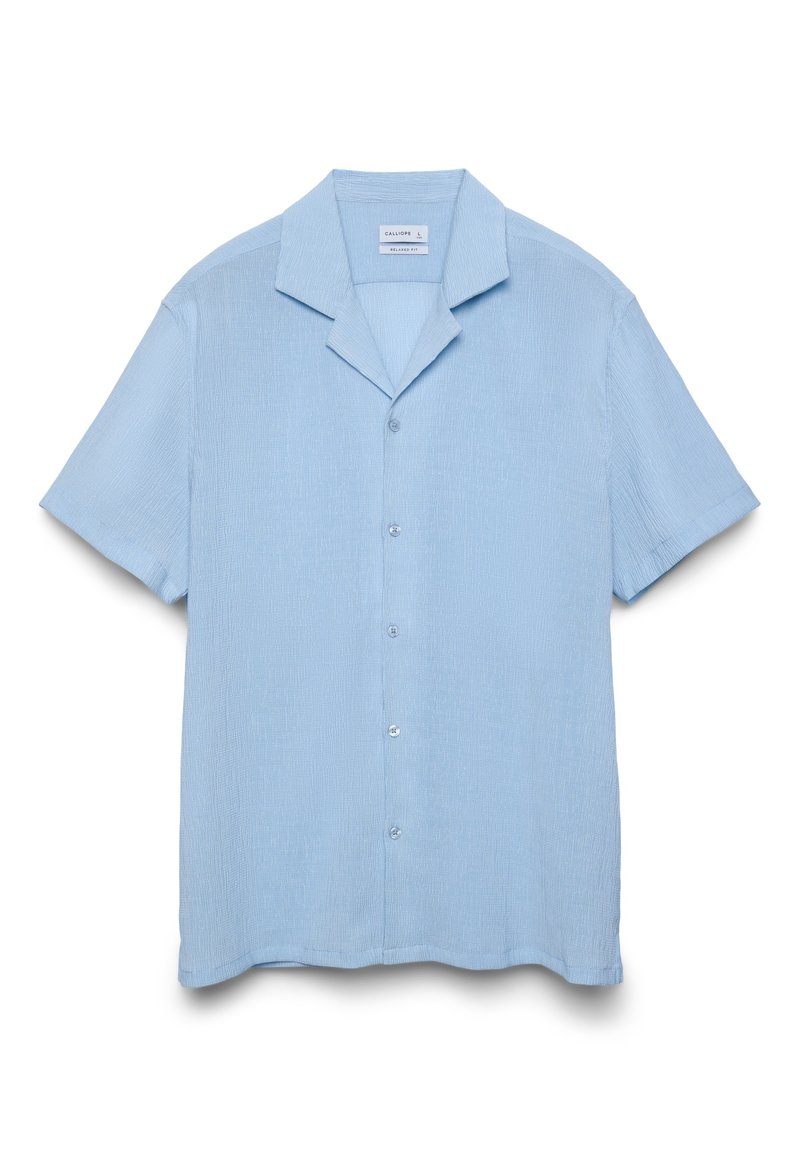 Hellblaues Kurzarmhemd mit Knopfleiste, lockerer Passform und Hemdkragen, vor weißem Hintergrund präsentiert.