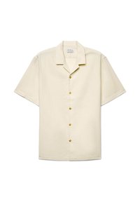 Beiges Hemd mit kurzen Ärmeln, aufgesetztem Kragen, fünf sichtbaren Knöpfen und lockerem Schnitt.