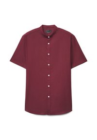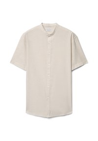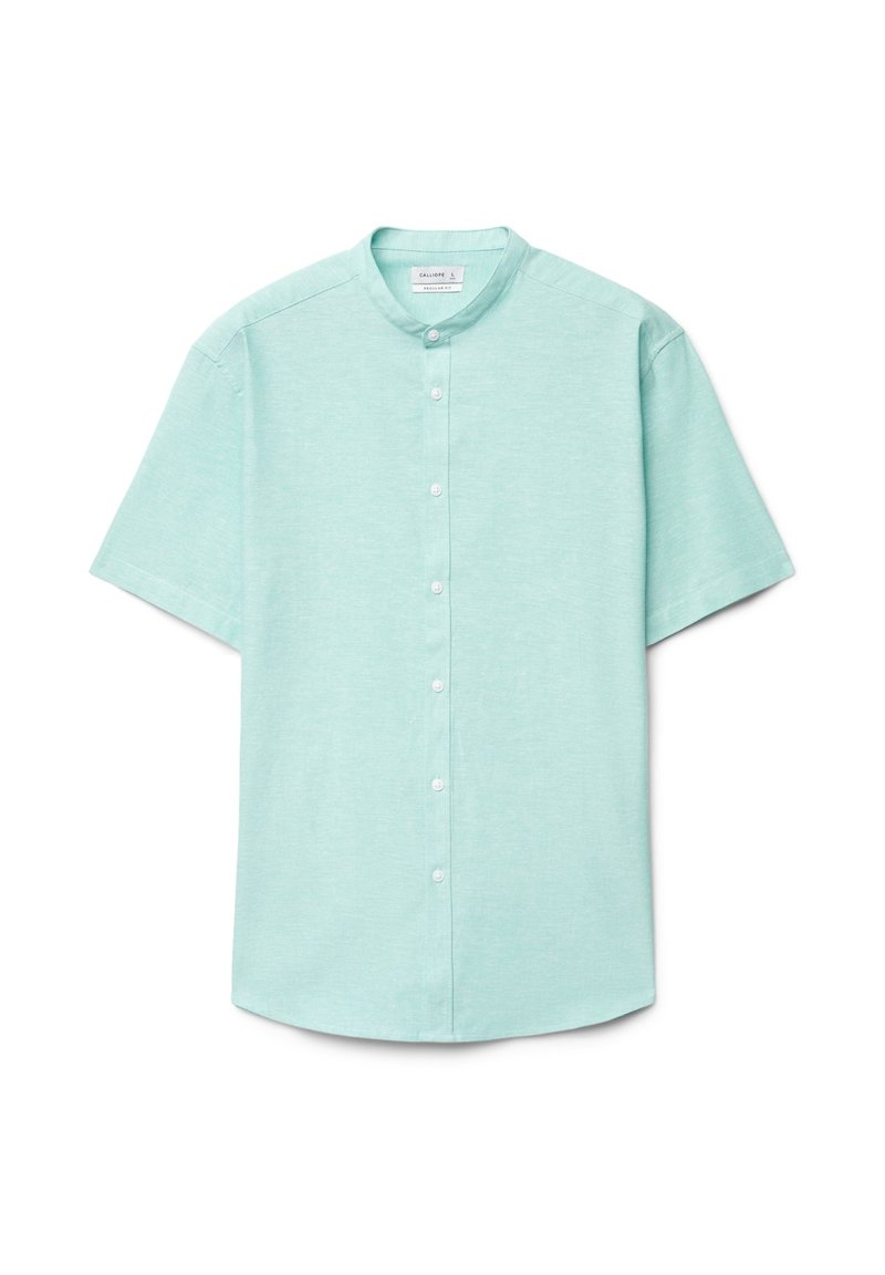 Kurzärmeliges, hellgrünes Hemd zum Knöpfen mit Mandarin-Kragen, aus leichtem Stoff gefertigt.