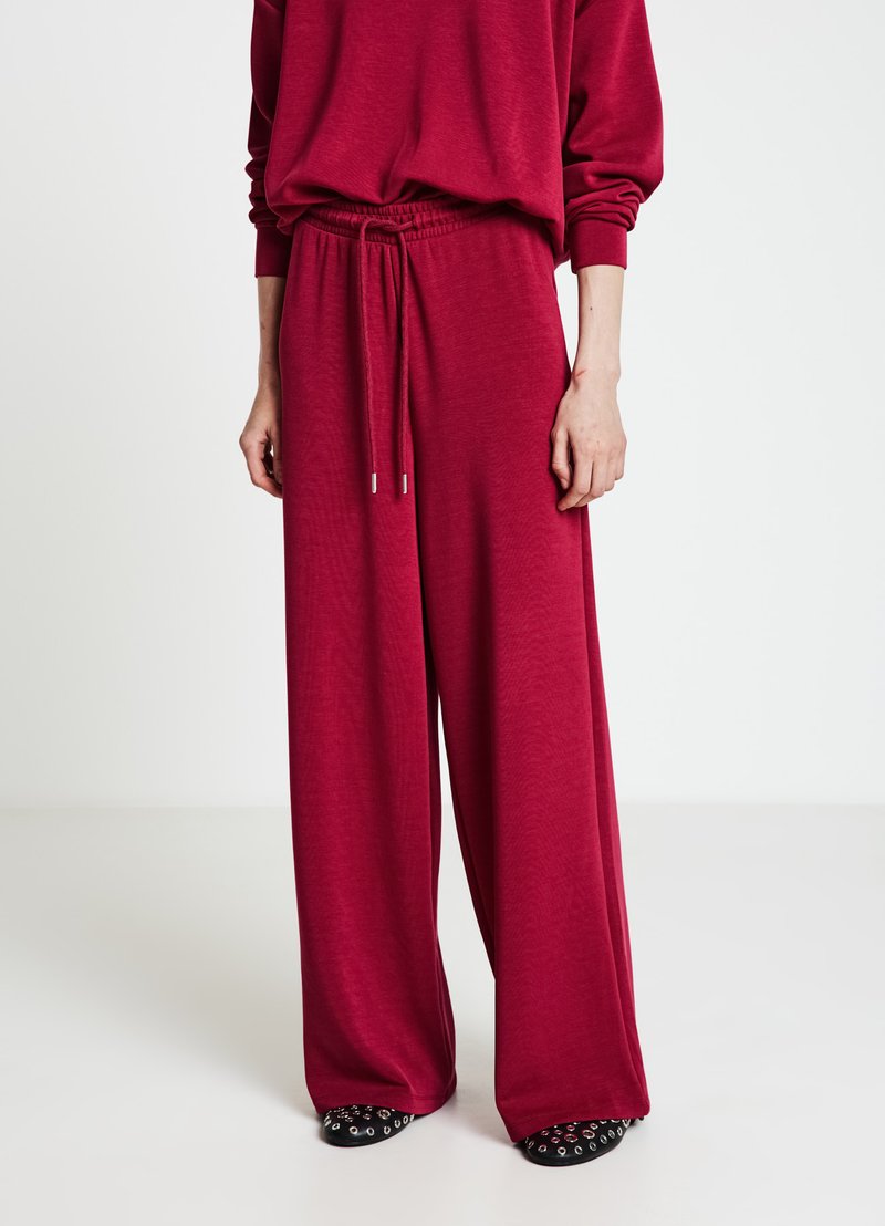 Weit geschnittene Jogginghosen in einem lebendigen Burgunderrot, mit elastischem Bund und Kordelzug, gefertigt aus einem weichen, leichten Stoff.