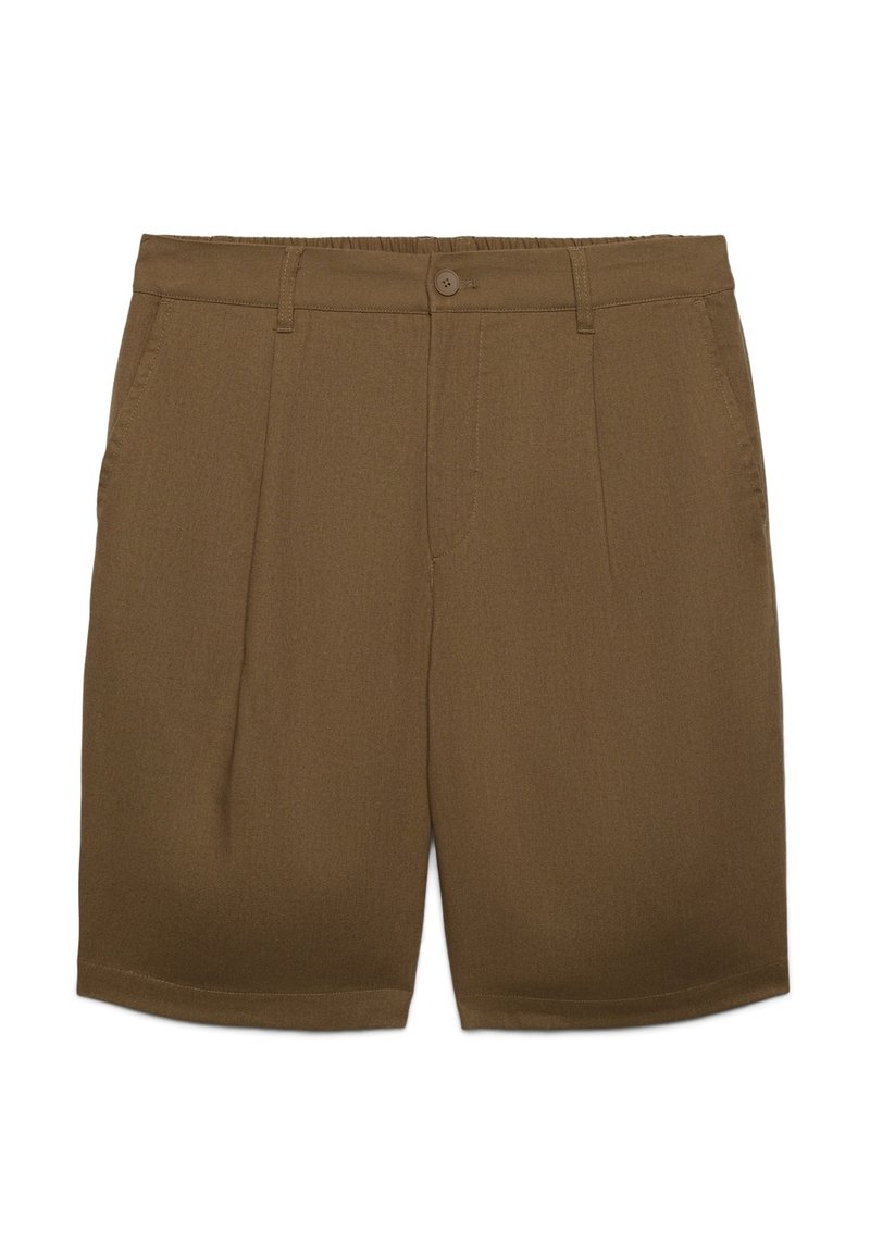 Braune maßgeschneiderte Shorts mit vorderer Knopf- und Reißverschluss, Seitentaschen, Gürtelschlaufen und knielangem Saum.