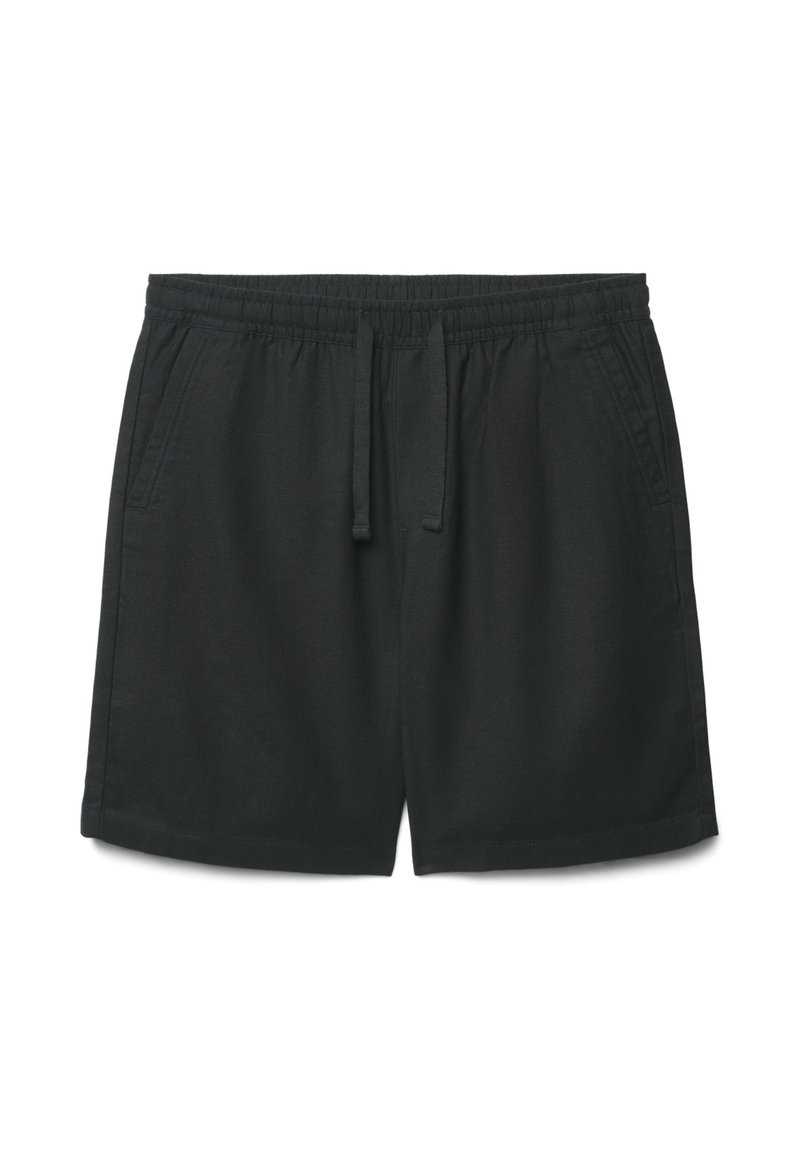 Schwarze Freizeit-Shorts mit elastischem Bund, Kordelzug und Seitentaschen, dargestellt vor weißem Hintergrund.