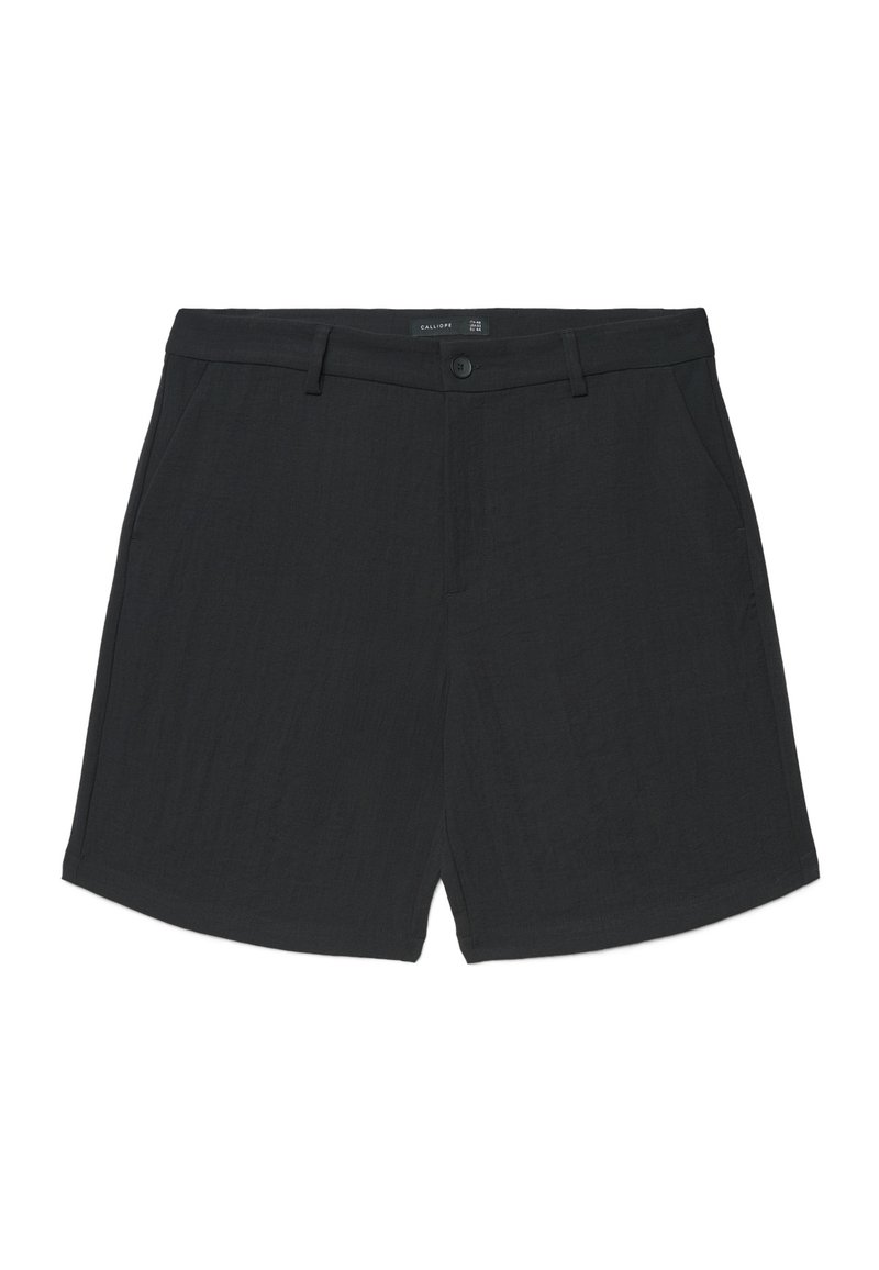 Schwarze, maßgeschneiderte Shorts mit Knopfverschluss, Gürtelschlaufen und Seitentaschen, flach auf weißem Hintergrund liegend.