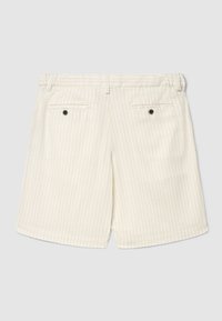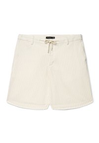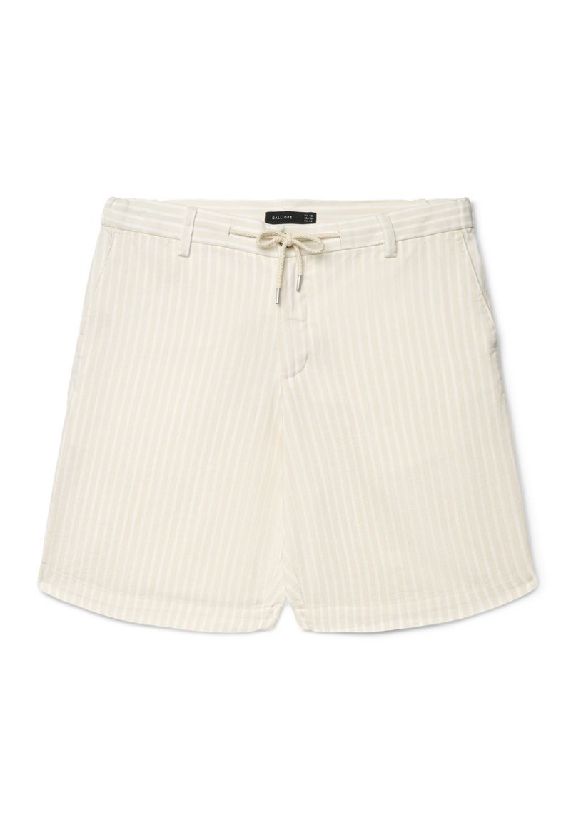 Beige Shorts mit dezenten weißen vertikalen Streifen, Gürtelschlaufen, Seitentaschen und einem vorderen Kordelzug mit Metallenden.
