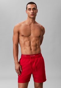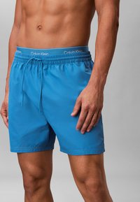 Männlicher Torso trägt blaue Badeshorts mit elastischem Bund und Kordelzug, sichtbarer Bund der Calvin Klein Unterwäsche oberhalb der Shorts.