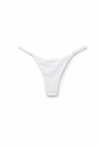Frau trägt ein schwarzes Bikini-Set mit goldenen Ringdetails an den dünnen Seitenriemen der Bikinihose und steht vor einem schlichten Hintergrund.