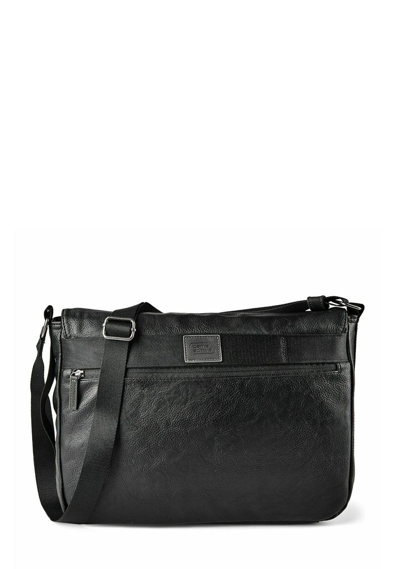 Schwarze Leder-Umhängetasche mit verstellbarem Riemen, Frontreißverschlussfach und kleinem Markenschild vor weißem Hintergrund.