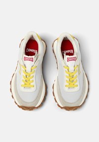 Weißer Sneaker mit gelben Schnürsenkeln und Akzenten, brauner profilierter Sohle, beigem Zehenkappe und rotem Logo auf der Zunge, auf weißem Hintergrund schräg nach rechts gestellt.