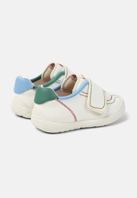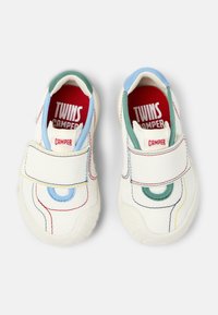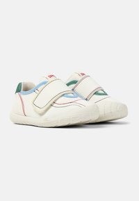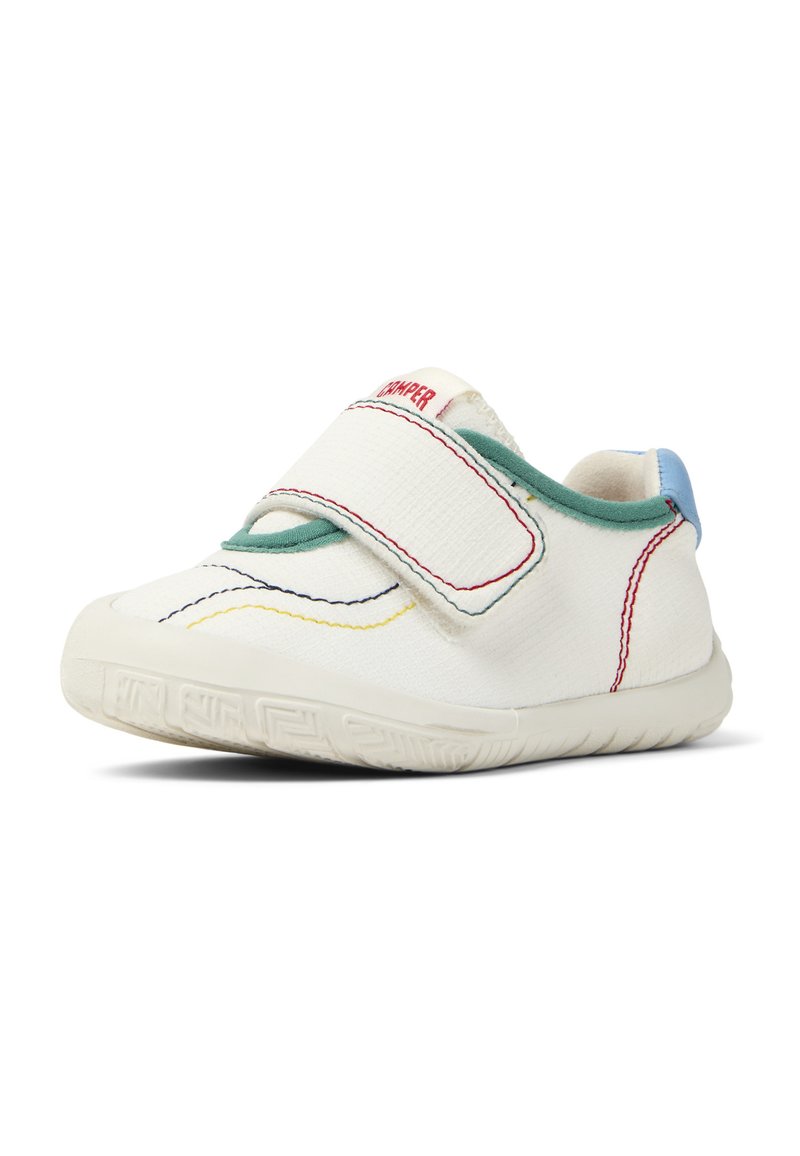Weißer Schuh mit strukturierter Oberfläche, versehen mit einem Klettverschluss, grünen und blauen Akzenten sowie bunter Naht auf dem Obermaterial. Gummisohle.