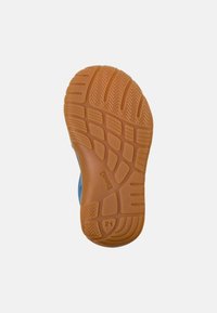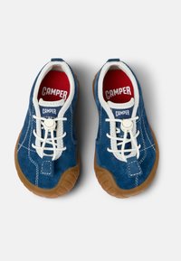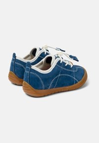 Blauer Wildlederschuh mit weißer Naht, elastischen Schnürsenkeln und Gummisohle. Verfügt über eine abgerundete Zehenpartie und eine profilierte Sohle für besseren Halt.