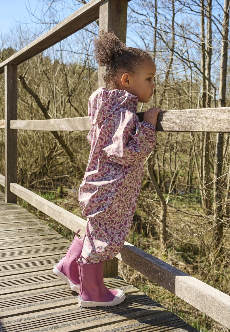 Hellrosa Regenmantel mit Blumenmuster, langen Ärmeln und Kapuze, kombiniert mit pinkfarbenen Gummistiefeln mit weißen Akzenten, stehend auf einem Holzsteg.