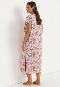 Frau steht barfuß vor einer weißen Wand und trägt ein rosafarbenes Midi-Kleid mit kurzen Ärmeln und floralem Muster, das vorne zum Knöpfen ist.
