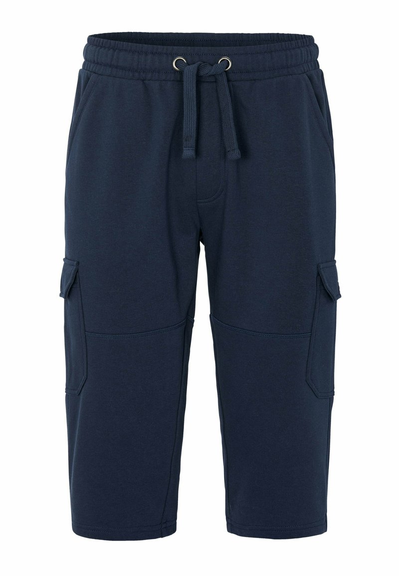 Marineblaue Cargo-Shorts aus weichem Stoff, mit einem elastischen Bund und Kordelzug, Seitentaschen und lockerem Schnitt.
