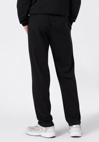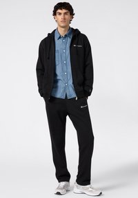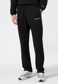 Schwarze Sporthose aus weichem Stoff mit elastischem Bund und unauffälligem Champion-Logo. Kombiniert mit hellen Laufschuhen.