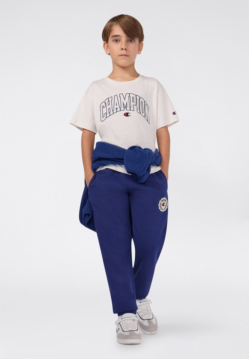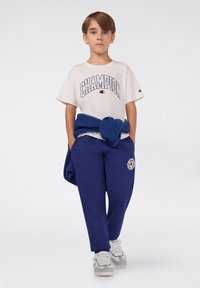 Weißes T-Shirt mit "CHAMPION" Grafik, blaue Jogginghose mit Logopatch, blauer Pullover um die Taille gebunden, helle Sneaker mit grauen Akzenten.
