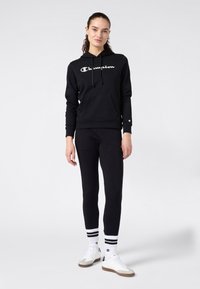 Schwarzer Hoodie aus Baumwollmischung, mit einer Tasche vorne, verstellbarer Kapuze mit Kordelzug und weißem "Champion"-Logo auf der Brust.