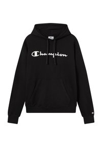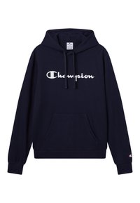 Marineblauer Champion-Hoodie aus Baumwolle, mit einer Vordertasche, Kordelzügen und einem gestickten Logo. Strukturierter Stoff mit gerippten Bündchen.