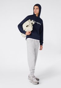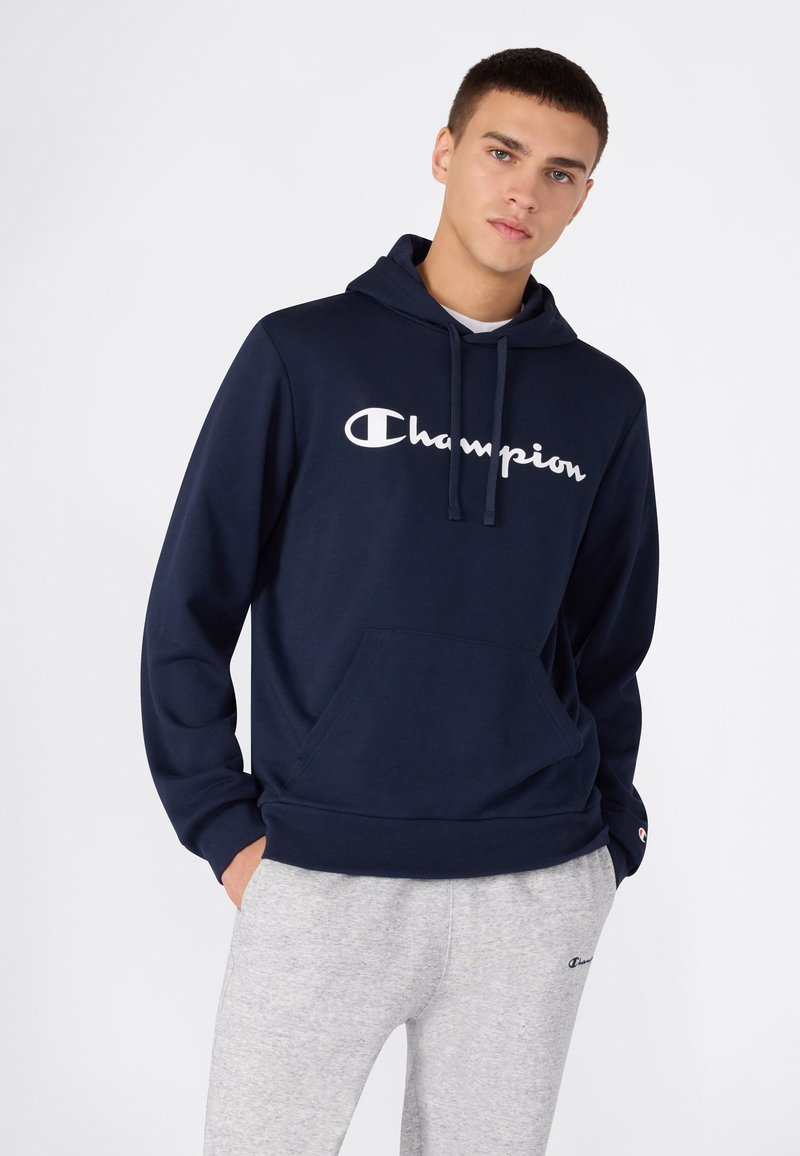 Navyblauer Hoodie aus Baumwollmischung mit weißem "Champion"-Logo, Kordelzugkapuze und Fronttasche. Kombiniert mit hellgrauen Jogginghosen.