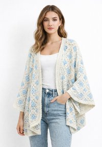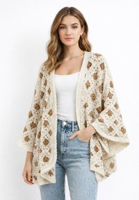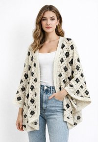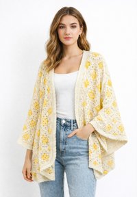 Junge Frau trägt eine cremefarbene und gelbe Häkeljacke über einem weißen Tanktop und hellblauen, hoch taillierten Jeans, sie steht vor einem weißen Hintergrund.