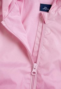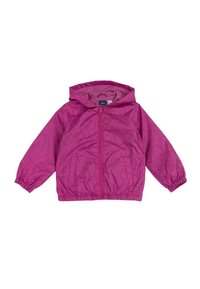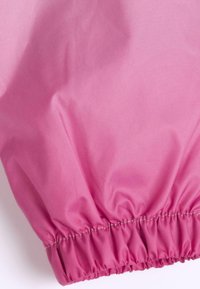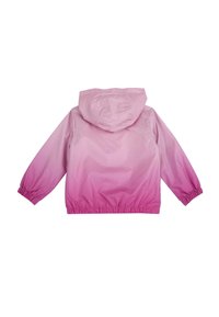 Rosa Windbreaker-Jacke mit einem Farbverlauf-Design, ausgestattet mit Kapuze, elastischen Bündchen, einem Reißverschluss vorne und zwei seitlichen Taschen. Glatte Textur.