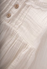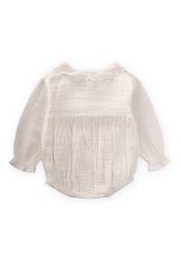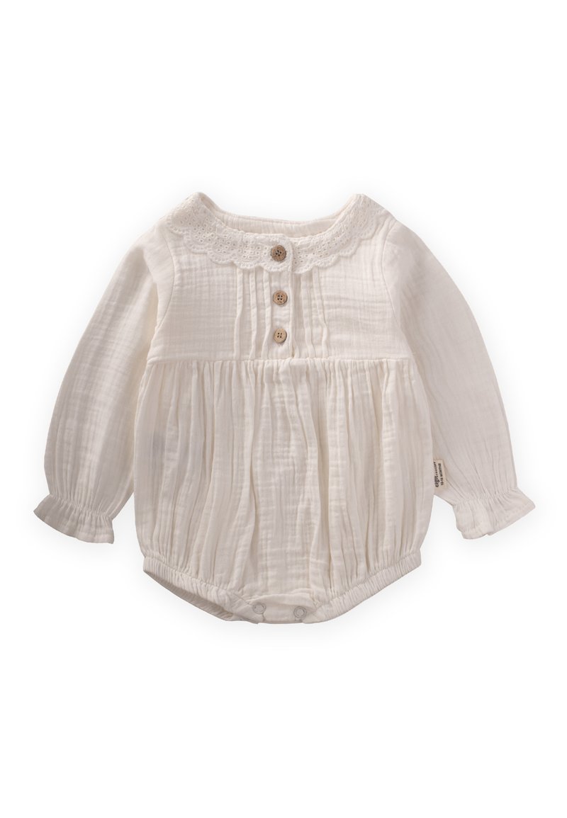 Weißer Baby-Strampler mit langen Ärmeln aus weichem Musselin. Verfügt über einen gekerbten Kragen, drei Holzknöpfe und geraffte Details an der Taille.